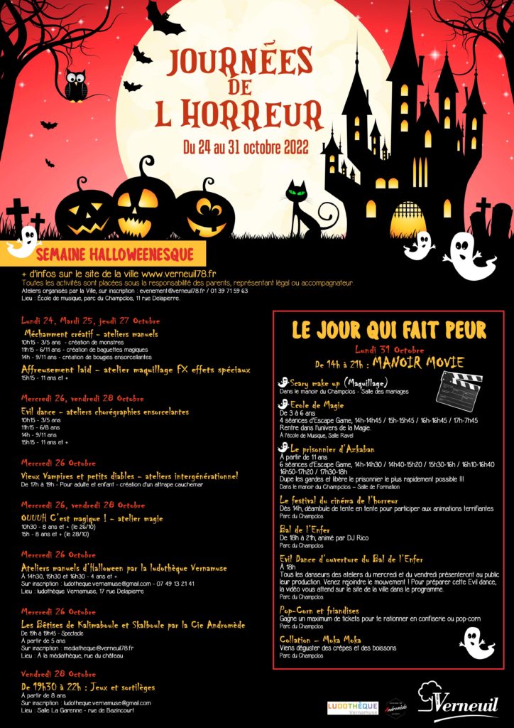 Du 24 au 31 octobre 2022, les journées de l’horreur sont de retour à Verneuil… Au programme, des ateliers manuels, des spectacles, des escapes games, un bal de l’enfer et de nombreuses autres activités. Découvrez le programme…