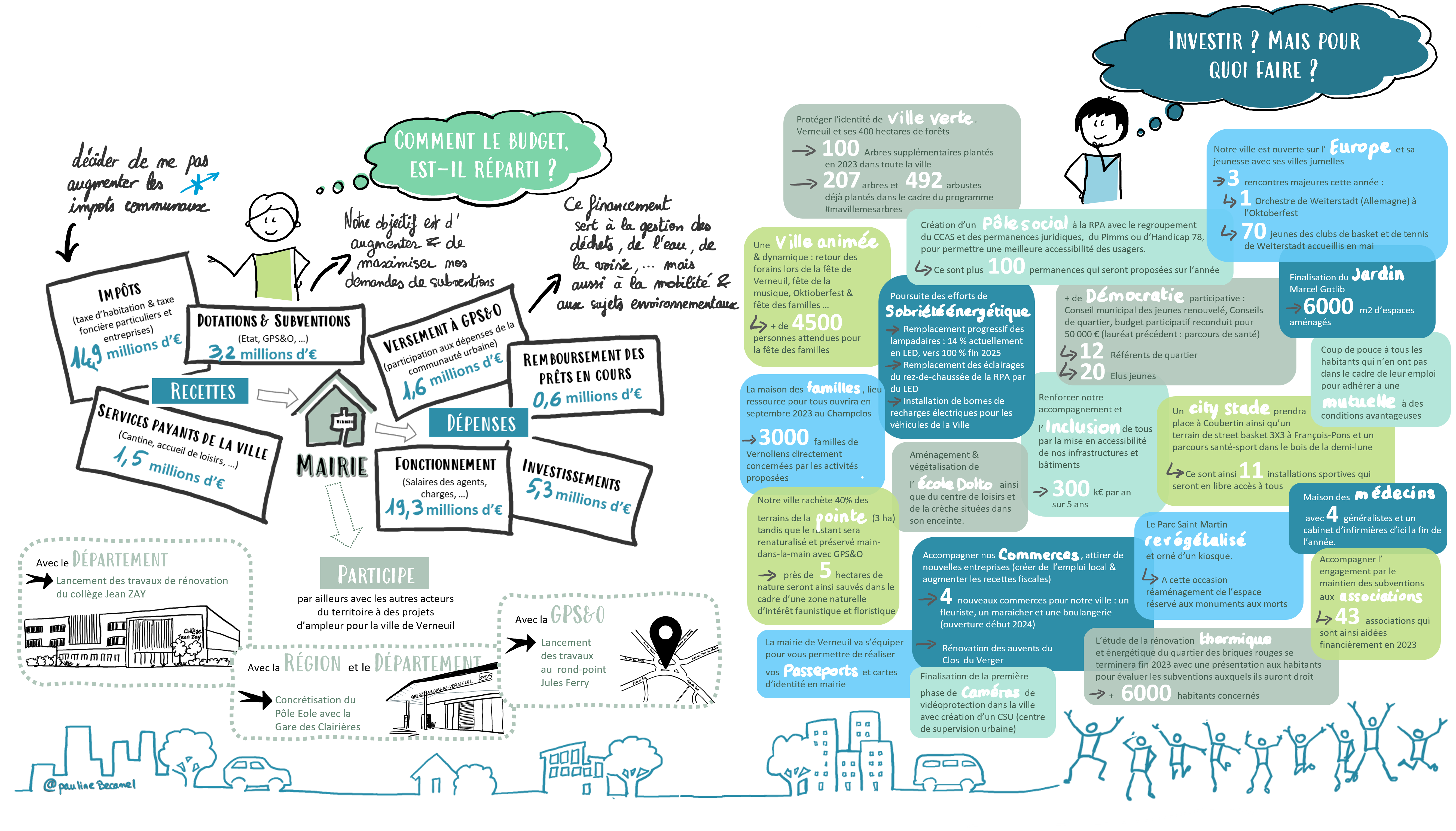 recettes proviennent des impôts locaux et taxes, des dotations de l’État, des prestations fournies à la population (cantine, crèches, centres de loisirs…). Les dépenses regroupent les charges nécessaires au fonctionnement de la collectivité : salaires du personnel municipal, entretien des bâtiments communaux, achats de matières premières et fournitures, prestations de services effectuées, subventions aux associations, intérêts de la dette…