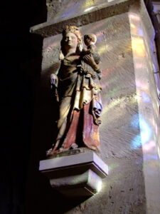 Classée au titre des Monuments historiques en 1905 , la Vierge et l’enfant est une statue de pierre peinte possédant une polychromie intéressante. Cette statue représente Marie recouverte d’un grand manteau bleu et le petit Jésus porté sur son bras gauche. La Vierge porte des ornements faits avec des cabochons de verre reproduisant des émeraudes. Restaurée en novembre 2001, cette statue a retrouvé sa place au sein de l’église.